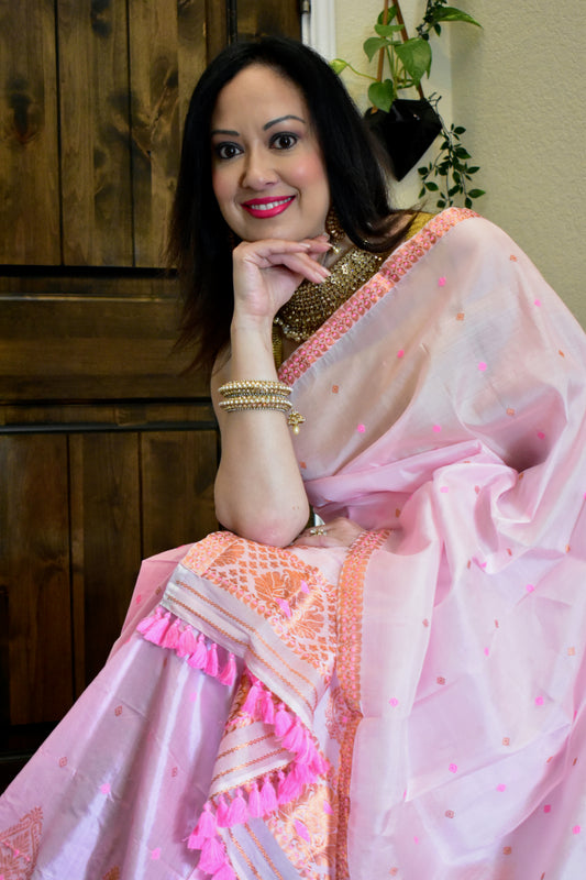 Handmade Baby Pink Assam Raw Silk (Kesa Paat) Sador with Assam Silk Mekhela